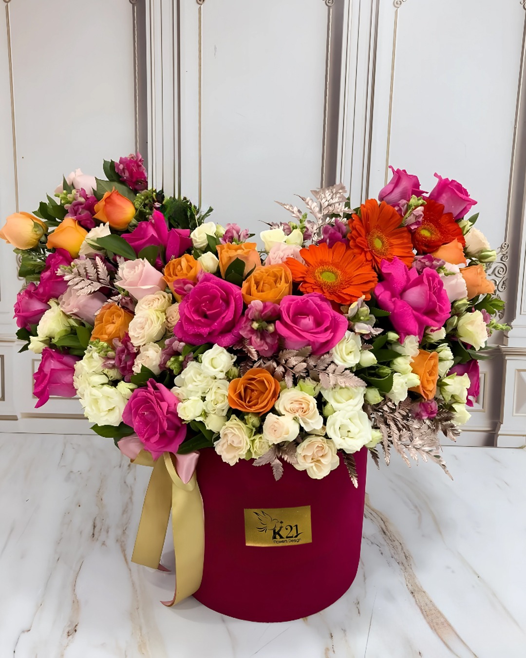 - Tamaño grande: 45 a 50 rosas premium (fucsia, rosado, durazno/anaranjado y crema) + claves + mini rosas + gerberas + lisianthus + finos follajes.